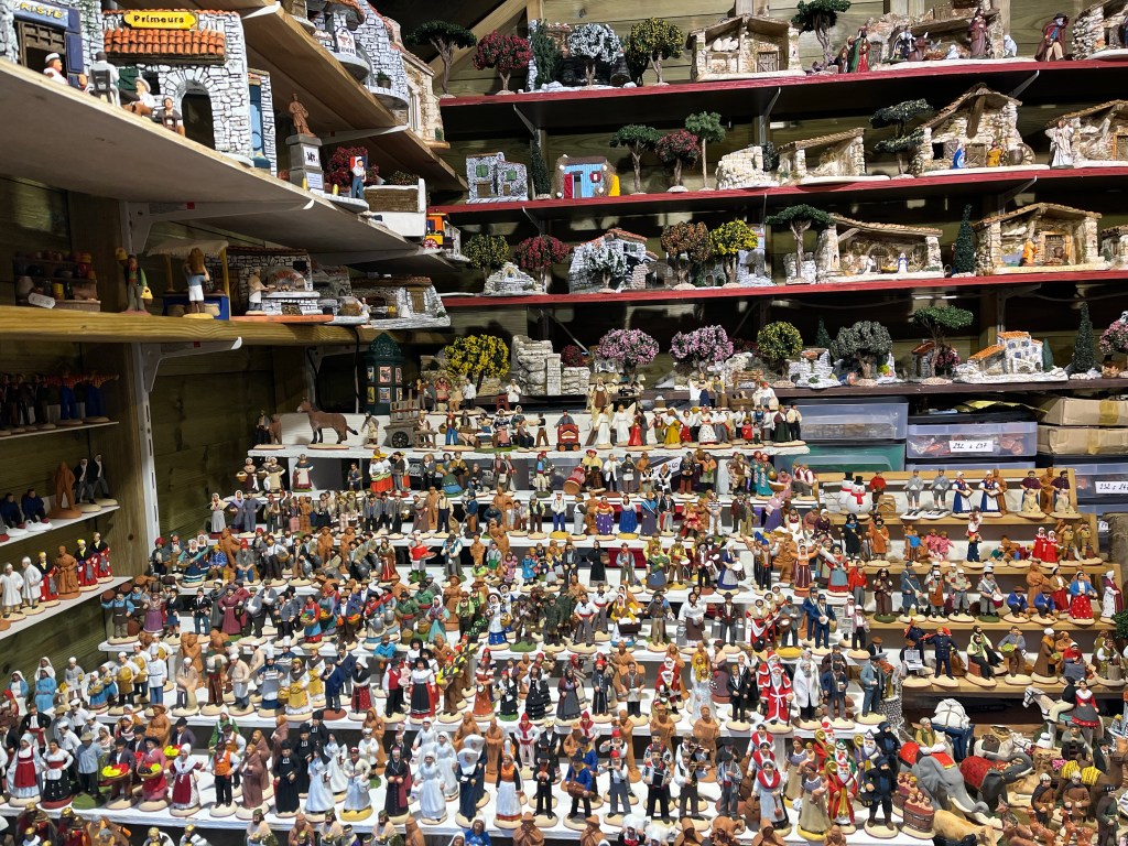 During the Christmas season you will see Santons for sale locally. So it’s no surprise that you will find them here. Santons meaning little saints; are small figurines made from clay that portray the colorful people, traditional trades, activities and costumes of Provence. Santons originate from the notion of the Provencal inhabitants en route to the Nativity with their offerings.