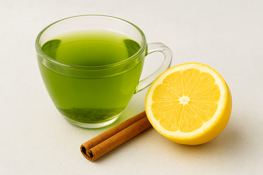 1 cup (240 ml) hot water (not boiling, around 80°C / 175°F) 1 green tea bag (or 1 tsp loose-leaf green tea) ½ tsp Ceylon cinnamon powder (or 1 small cinnamon stick) 1 tsp fresh lemon juice (optional, for extra fat-burning and vitamin C boost) ½ tsp raw honey (optional, for sweetness and soothing effect)